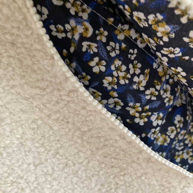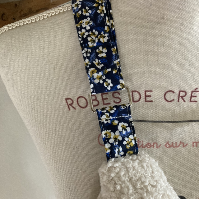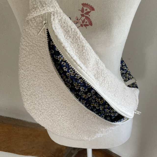 Sac banane en tissu bouclette écru pour l’extérieur et un coton fleuri bleu marine pour l’intérieur et la sangle. Cette banane dispose également de deux poches.